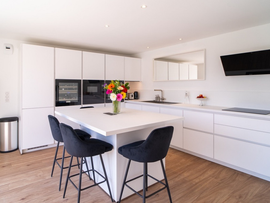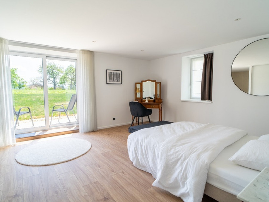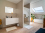 RDC : entrée avec dressing, bureau, salon/séjour donnant sur une cuisine ouverte (60m2) avec accès direct à la terrasse (75m2) et au jardin, chambre avec dressing et salle d'eau (30m2) accès terrasse et jardin, buanderie/cellier, WC, garage, chaufferie