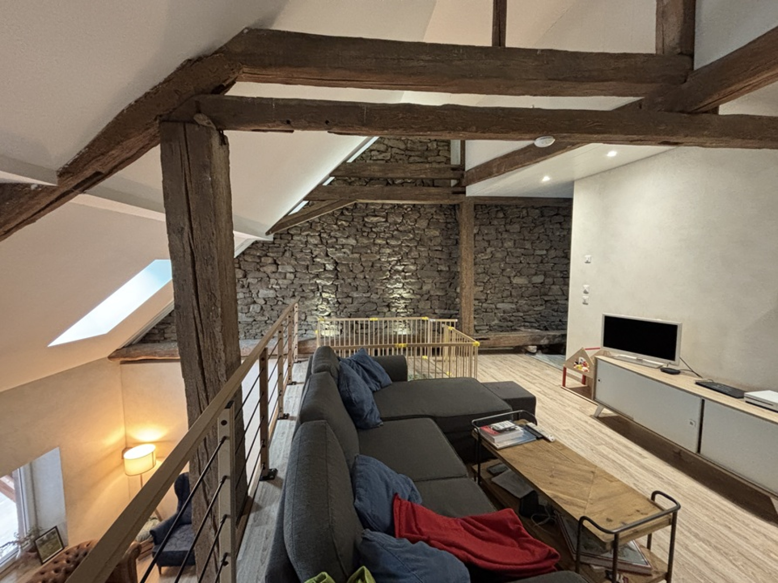 située au centre ville, cette maison traversante bénéficie d'une rénovation de qualité et beaucoup de charme (pierres apparentes, poutres,...) et offre de beaux volumes. Elle est composée comme suit :